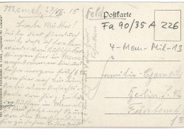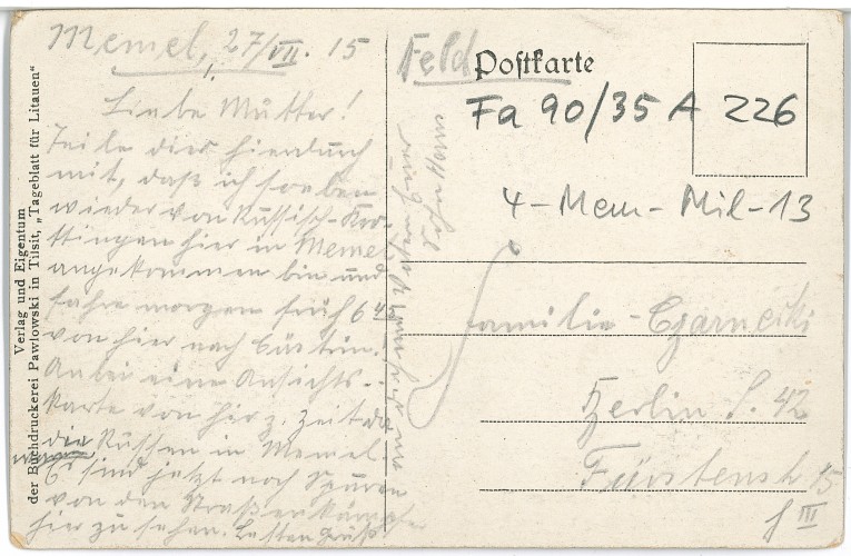 In der Tat ist der militärische Hintergrund auch aus der einzigen gelaufenen der drei Karten deutlich ersichtlich. Ende Juli 1915 nutzte Hans Szameitis die Karte mit der Fotografie des toten russischen Soldaten und des Pferdekadavers, um seiner Mutter in Berlin mitzuteilen, dass er aus dem Osten kommend in Memel eingetroffen sei und am nächsten Morgen mit dem Zug nach Cüstrin (Kostrzyn) weiterfahren werde. Aus dem Text geht hervor, weswegen er diese Karte ausgewählt hatte: „Anbei eine Ansichtskarte von hier z. Zt. da die Russen in Memel waren. Es sind jetzt noch Spuren von den Straßenkämpfen hier zu sehen.“ Hans deklarierte die Postkarte handschriftlich zur Feldpostkarte, so dass sie kostenlos befördert wurde und dementsprechend auch keine Frankierung (und in diesem Fall auch keinen Stempel) trägt.