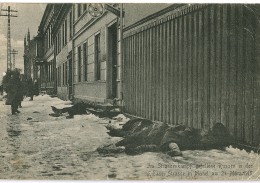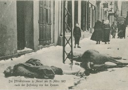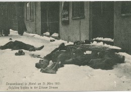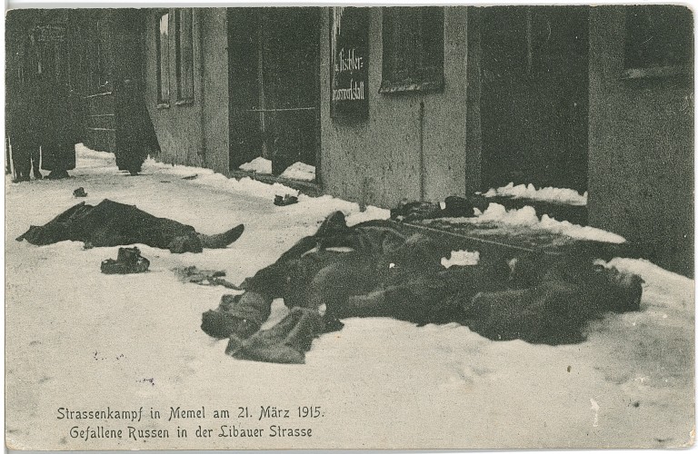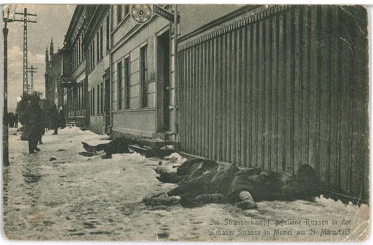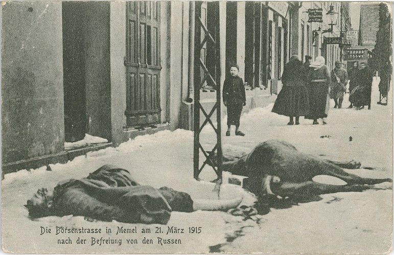 Es sind verstörende Bilder, die auf den drei Ansichtspostkarten abgebildet sind: gefallene russische Soldaten in der Libauer und der Börsenstraße in Memel (Klaipeda) im damaligen Ostpreußen. Die Aufnahmen sind offenbar unmittelbar nach dem Ende eines Kampfes gemacht worden; noch sind keinerlei Tätigkeiten zu entdecken, die auf einen bevorstehenden Abtransport der Toten und des Pferdes schließen lassen. Andererseits hat sich die Bevölkerung offenkundig schon an den Anblick gewöhnt, bis auf einen kleinen Jungen, dessen Interesse wohl auch durch den Fotografen geweckt ist, scheint sich bereits wieder der Alltag eingestellt zu haben: Die beiden Frauen im Hintergrund wenden der Szene den Rücken zu und setzen offenkundig ihren Weg gemächlich gehend fort.