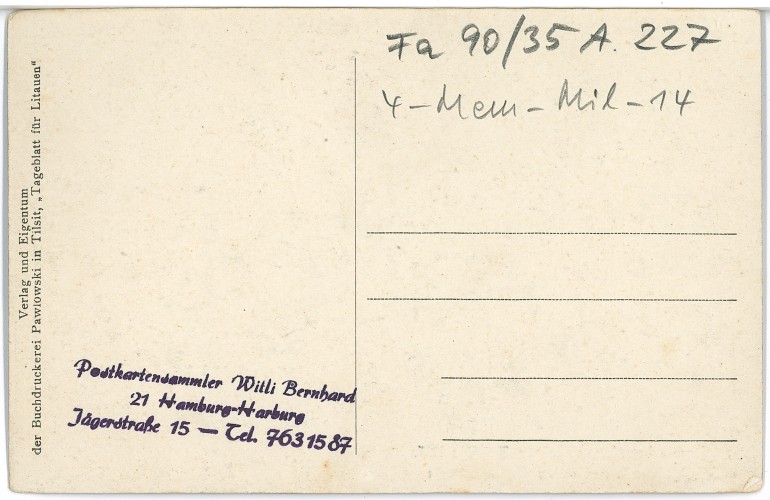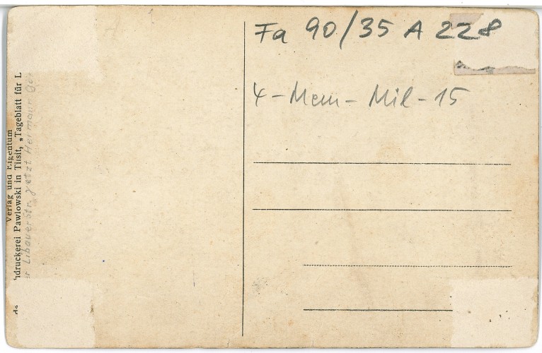 Offenkundig erfüllte die Postkarte in unserem Fall vor allem die Funktion der Kriegsberichterstattung. In der Tat war der Erste Weltkrieg in dieser Hinsicht eine Zeitenwende: Die visuelle Vermittlung des Geschehens stillte in zunehmendem Maße das Informationsbedürfnis in der Heimat. Ansichtspostkarten mit militärischen Motiven oder mit Landschaftsaufnahmen aus der jeweiligen Einsatzregion wurden von den Soldaten wohl gerne als Feldpostkarten genutzt. „Mittels Bildern wohnten die Betrachter nun kriegerischen Ereignissen bei, die zeitnah zu ihrem Alltag stattfanden.“ (Gerhard Paul) Allerdings waren Motive wie die aus Memel eher selten, meist herrschte die heroische Darstellung der eigenen Krieger zumindest bei offiziellen Fotografien vor. Anders verhielt es sich bei soldatischen Amateurfotografen, auf die auch die Memeler Aufnahmen zurückgehen könnten. Die Postkarten wurden von der Buchdruckerei Pawlowski in Tilsit verlegt, von der weitere Kriegspostkarten belegt sind. Durch Hans Szameitis, der das Datum seiner Nachricht festhielt, wissen wir, dass die Karten mit den Motiven aus Memel bereits im Sommer 1915 in Umlauf waren. Sie wurden jedoch ein weiteres Mal zur Bebilderung eines Erlebnisberichtes verwendet, der 1916 unter dem Titel „Der Russeneinfall in Memel im März 1915. Eigene Erlebnisse aus jenen Schreckenstagen von Emil Schadereit“ ebenfalls bei Pawlowski erschien und für den sich die Bilder zur Zweitverwertung geradezu anboten. Die im Buch abgedruckten Abbildungen entsprechen im Übrigen denen der Postkarten, und weitere Bilder gefallener russischer Soldaten finden sich nicht. So ist davon auszugehen, dass am 21. März 1915 keine weiteren Fotos in den Memeler Straßen entstanden waren, die in die Hände des offenkundig geschäftstüchtigen Buchdruckers Pawlowski gelangten. Zweifellos hatte der Verlag mit seiner Motivauswahl neben patriotischen Motiven durchaus auch lukrative Überlegungen im Sinn. Denn es lag nahe, dass die auf dem Marsch befindlichen Soldaten die Bilder kaufen und als Feldpostkarten nutzen würden.