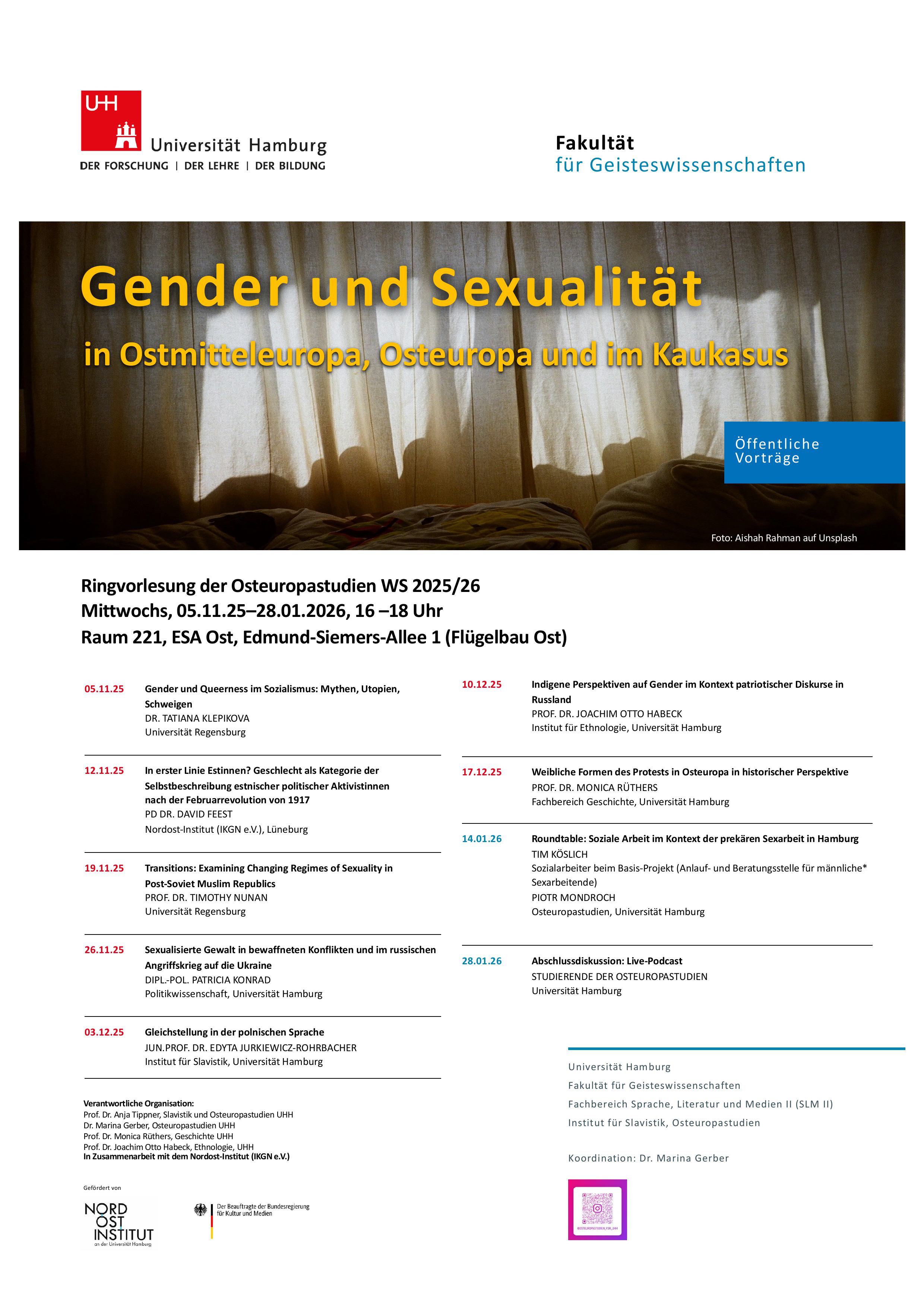 Die Ringvorlesung ist eine Veranstaltung der Osteuropastudien der Universität Hamburg. Für die Organisation sind verantwortlich: Prof. Dr. Anja Tippner, Dr. Marina Gerber, Prof. Dr. Monica Rüthers und Prof. Dr. Joachim Otto Habeck. Die Ringvorlesung wird in Zusammenarbeit mit dem Nordost-Institut (IKGN e.V.) veranstaltet.