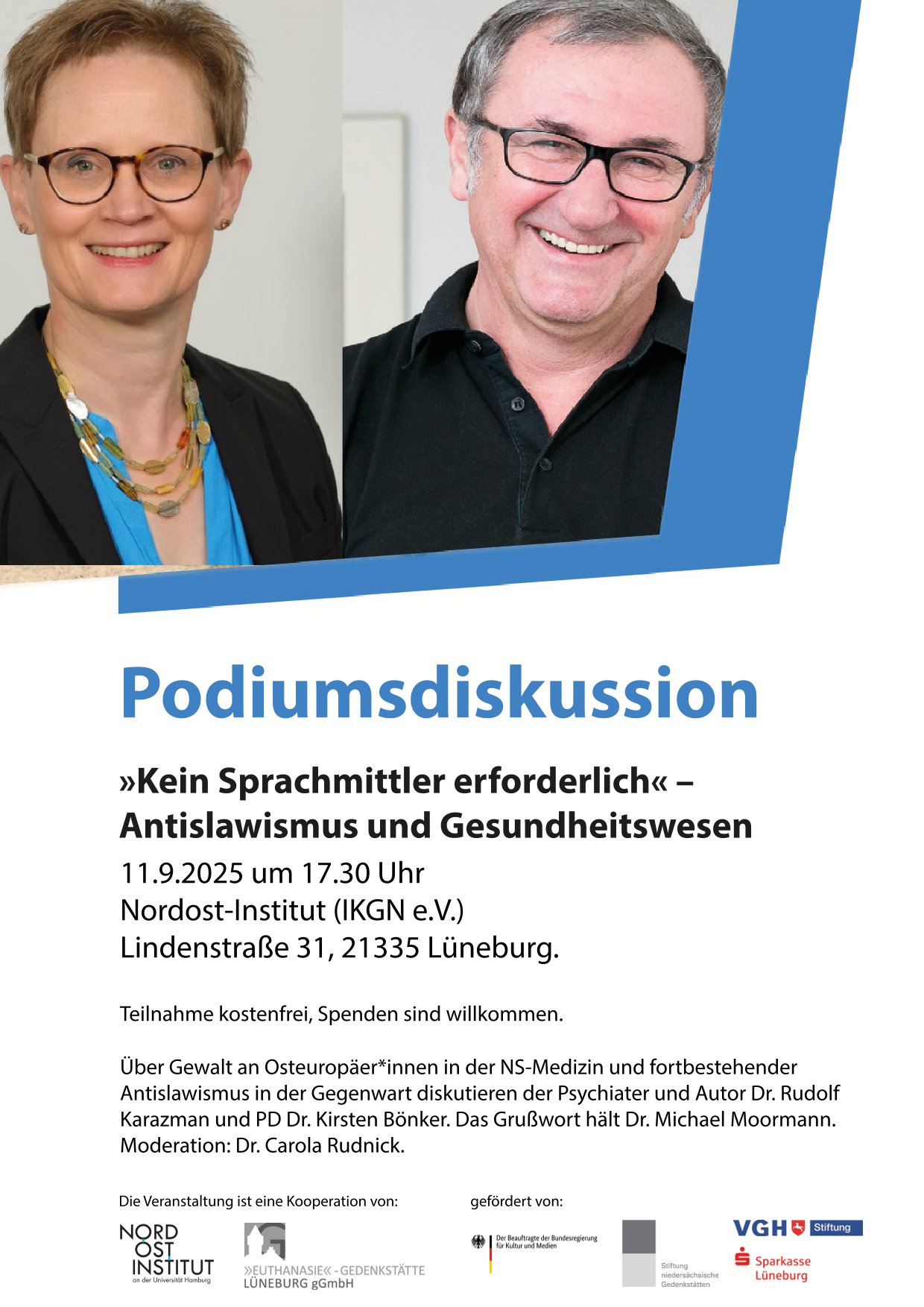 Die Eröffnung der Dauerausstellung wird von August bis November 2025 mit einem umfangreichen Begleitprogramm gefeiert. Teil dessen ist das Podiumsgespräch "»Kein Sprachmittler erforderlich« – Antislawismus und Gesundheitswesen". Nach einem Grußwort von Michael Moormann, Geschäftsführer des Klinikums Lüneburg, sprechen Rudolf Karazmann, Psychater und Autor, und Kirsten Bönker, Direktorin des Nordost-Instituts, über die Gewalt an Osteuropäer:innen in der nationalsozialistischen Medizin sowie über den fortbestehenden Antislawismus.
